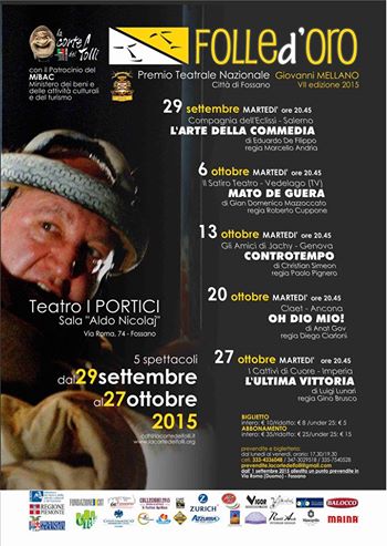 In queste poche righe vorremmo provare a raccontare, come spesso ci capita, ciò che abbiamo vissuto in quel di Fossano, un delizioso paesino in provincia di Cuneo, in cui quest’anno per la II volta abbiamo avuto l’opportunità di partecipare al festival nazionale di teatro amatoriale denominato “Folle d’oro” dedicato alla memoria di Giovanni Mellano e organizzato dalla compagnia “La corte dei folli”.